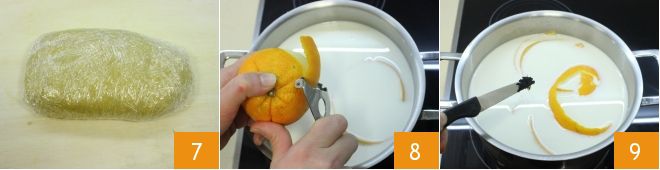Wrap it with plastic wrap 7 and place it in the refrigerator for about 1 hour. Now take care of the rice pudding filling: heat the milk in a high-edged saucepan over medium heat. Wash an orange and peel its zest with a vegetable peeler and add it to the milk 8. With a small knife, slit a vanilla pod and extract the seeds by sliding the knife blade along the inside of the pod. Add half the pod and the seeds to the milk 9.