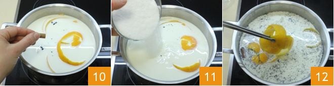 Add the cinnamon stick 10, then also add the granulated sugar 11 and salt. Stir to blend all the flavors and dissolve the sugar. Bring the milk to a simmer, remove the orange zest, cinnamon stick, and vanilla pod with kitchen tongs 12
