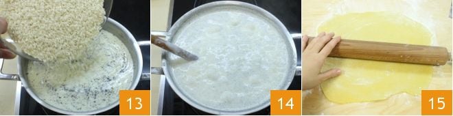 and then add the rice 13 and cook over a low heat, stirring occasionally. Leave it on the heat for 30 minutes, and if it dries out too much, add more hot milk. At the end of the preparation, the rice pudding should have a rather creamy consistency 14. When the rice is cooked, let it cool. Now retrieve the shortcrust pastry from the refrigerator, remove the plastic wrap, and divide it in half: roll out half on a floured work surface or pastry board. Make a sheet about 1/5 inch thick 15.