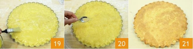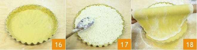 Then butter and flour an 11-inch diameter mold; roll the shortcrust sheet on the rolling pin and unroll it over the mold. Slide the rolling pin over the edges of the cake tin to remove the excess dough and adhere the pastry to the edge and bottom 16. Then combine the leftover dough with the remaining pastry. Then pour the rice cream into the mold, leveling the surface with a wooden spoon 17; roll out the remaining half of the dough to the same thickness as the base and cover the tart to close it 18. Adhere all the edge points to seal the two doughs.