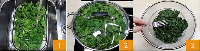 To prepare rich spinach with béchamel, start by cleaning and washing the spinach 1 (or get fresh spinach already washed, bagged, and ready to cook). After washing the spinach, boil them over medium heat (for about 5-6 minutes) with the water that the spinach retained during washing, covering the pot with a lid 2. Once cooked, squeeze them well to remove excess water 3.