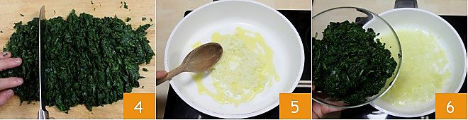 Roughly chop the spinach 4. Sauté the chopped onion over very low heat with two tablespoons of extra virgin olive oil 5, and as soon as the onion becomes transparent (it will take at least 10 minutes), add the spinach and sauté them for a few seconds over low heat 6.