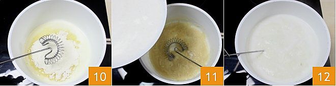 Meanwhile, prepare the béchamel (for more details, see the Béchamel sauce recipe). Start by heating the milk (without boiling it) 7 and add a pinch of salt and nutmeg 8. In another pot, melt the butter 9