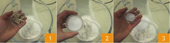 To prepare the ricotta and chocolate small donuts, start with the dough: put flour, crumbled fresh yeast 1 20 g of sugar taken from the total amount 2, and salt 3 in a stand mixer with a hook attachment