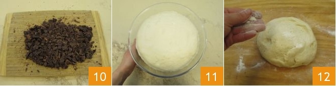 In the meantime, chop the dark chocolate with a knife 10. After the rising time, the dough will have doubled in size 11. Lightly flour the work surface, place the dough on it 12