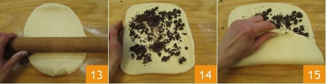 and gently roll it out with a rolling pin 13, turning it from side to side to obtain a rectangle about 3/4 inch thick, on which you will place the previously chopped chocolate 14. Once the chocolate is added, fold the dough by folding 1/3 of the sheet towards the center 15