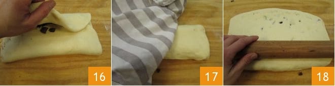 now fold the opposite edge 16. Press lightly to adhere the sheet, then cover with a cloth 17 and let the dough rest for about 10 minutes. After the resting time, roll out the dough with the rolling pin 18