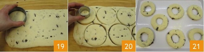 until you obtain a rectangle about 3/4 inch thick. At this point, you are ready to make the small donuts; use a 4-inch diameter cookie cutter to cut out disks 19, then use a 1.5-inch cutter to cut out the center to form the donuts 20. Re-kneading the scraps yields 9 small donuts. Place the cut-out donuts on a tray 21,