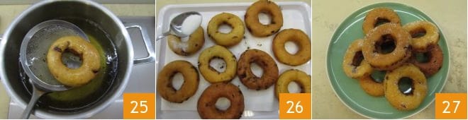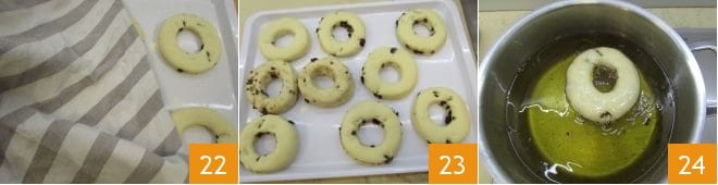 covered with a cloth 22 and continue to let them rise for half an hour. After the rising time, your small donuts are ready for cooking 23. Heat the seed oil, and when it reaches 340°F, immerse one donut at a time 24 to avoid lowering the oil's temperature (we recommend using a food thermometer to monitor the oil temperature).