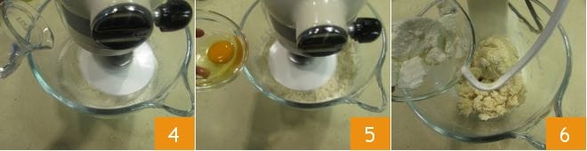 Start working the dough with the hook at medium speed, then slowly pour in the water 4 and once absorbed, add the egg 5 and let it incorporate into the mixture. At this point, add the well-drained ricotta 6