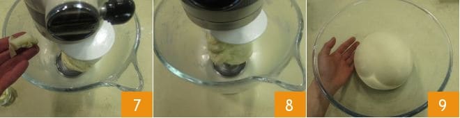 And finally, add the butter one piece at a time, keeping the mixer going 7. Continue working the dough until it is completely smooth and homogeneous, it should cling to the hook and detach from the sides of the bowl 8. Overall, working the dough will take about 25-30 minutes. Once ready, place the dough in a bowl 9, cover with plastic wrap, and let it rise for 1 hour in a dry place.