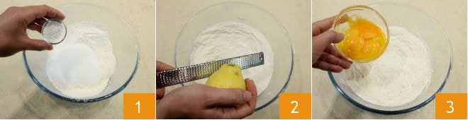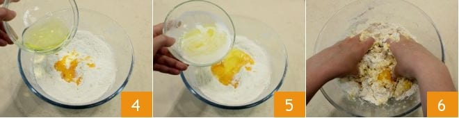 the egg white 4, and lastly the melted butter 5. Mix the ingredients directly in the bowl 6, then work it on a work surface just long enough to form a smooth dough.