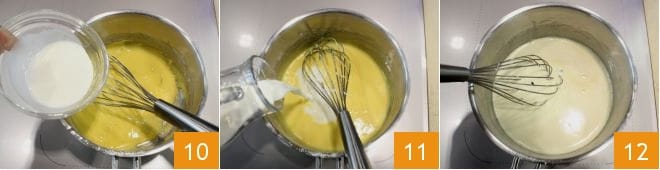 Add the cream and milk (10-11), mix with the whisk to combine them and turn on the low heat. Add the seeds of half a vanilla bean and cook the cream, continuing to stir with the whisk 12