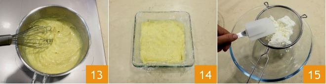 until you have achieved the ideal creamy consistency 13; transfer the cream into a bowl and cover it still warm with plastic wrap in contact 14 to prevent the annoying skin from forming on the surface as it cools. Once it has cooled to room temperature, place it in the refrigerator. Meanwhile, take the ricotta (which you will have drained for at least two hours or better yet the night before) and sieve it with a fine-mesh strainer, repeating the operation several times to make it creamier 15.