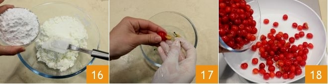 Add the powdered sugar 16 and mix to combine the ingredients; cover the cream and place it in the refrigerator. Now dedicate yourself to the sour cherries: remove each stem and pit 17, then pour them into a pan 18
