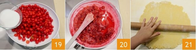 add the sugar 19 and cook them over moderate heat with the lid on for at least 20 minutes or until the liquid has almost completely evaporated, stirring occasionally 20. At that point, turn off the heat and let them cool. Then take the pastry, roll out half the dough into a disc about a quarter inch thick 21