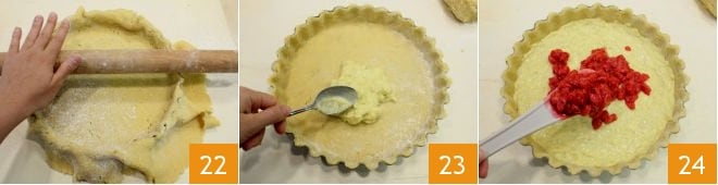 butter and flour a 11-inch diameter pan; roll the pastry disc onto the rolling pin and unroll it onto the pan. Roll the rolling pin over the edges to eliminate the excess dough 22 (you can combine the scraps with the other half of the pastry), make the pastry adhere perfectly to the pan, and garnish the bottom with a layer of custard 23, then also pour in the cooked sour cherries, now cold 24