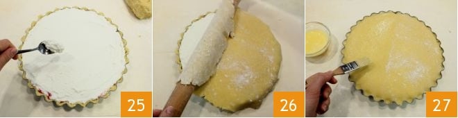 and cover it all with the ricotta cream 25, distributed evenly. Roll out the other half of the pastry dough along with the scraps and cover with the obtained disc 26. Seal the edges well so that the filling doesn't leak out during baking, then brush the surface with a beaten egg with a tablespoon of cream 27. Bake in a preheated static oven at 350°F for about 50 minutes (320°F for 40 minutes if using a fan oven).
