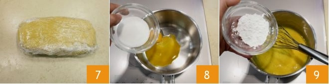 Shape it into a rectangular form and wrap it in plastic wrap 7, then place it in the refrigerator to firm up for at least 30 minutes. Meanwhile, prepare the cream: in a saucepan, pour the yolks, sugar 8, mix with a whisk, and also add the rice starch 9. Alternatively, you can use cornstarch or potato starch.