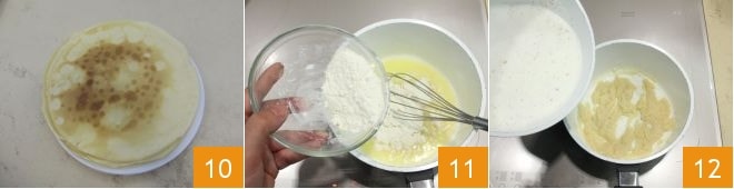 Continue this way until all 4 crepes are cooked, and gradually place them on a plate 10, covering them with plastic wrap once they have cooled to prevent them from drying out. Then, prepare the Béchamel sauce. Melt 3.5 tbsps of butter in a large saucepan over very low heat, then form the roux by sprinkling in the flour 11. Stir continuously with a whisk to obtain a golden mixture. Then, dilute with the warm milk 12 and adjust the seasoning with salt and nutmeg.