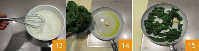 Continue stirring for a few minutes over moderate heat until your béchamel becomes thick 13. At the end of cooking, transfer the sauce to a container, cover with contact plastic wrap, and let it cool. Finally, take care of the spinach. After removing the roots and rinsing them thoroughly, blanch them in a pan where you have heated 3.5 oz of extra virgin olive oil and a peeled but whole clove of garlic (so you can remove it more easily) 14. Add a pinch of salt and pepper, cover with a lid, and cook over high heat for 7-8 minutes, until the spinach is softened 15.