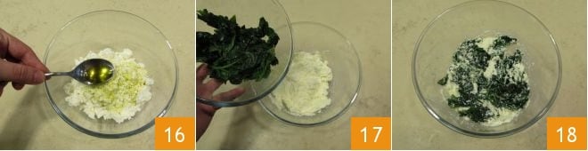 Meanwhile, place the ricotta in a container, add 1.5 tbsps of extra virgin olive oil 16, and adjust the seasoning with salt and pepper, then quickly work with a fork to combine everything. Add the drained, squeezed, and cooled spinach (without the garlic) 17, also add the grated cheese 18, and mix everything together.