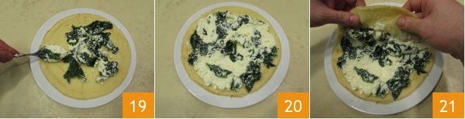 Now you can assemble your ricotta and spinach crepes: take a plate, place a crepe, and pour a bit of ricotta and spinach filling in the center 19, then carefully spread it over the entire surface 20. Lift part of the crepe and fold it over itself to form a half-moon 21.