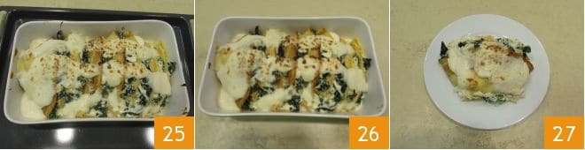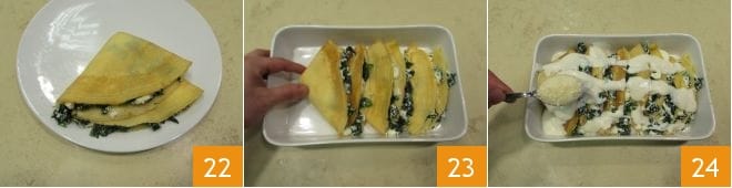 Then fold the half-moon in half again to create a small fan shape 22. As you fill them, arrange the folded ricotta and spinach crepes in a slightly greased baking dish 23. Sprinkle the crepes with béchamel and grated cheese 24;