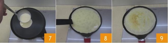 Heat and lightly grease a crepe pan about 11 inches in diameter or a thick-bottomed non-stick pan: grease with very little butter and pass the entire surface with a paper towel (this operation will need to be repeated at least once more after cooking the first two crepes). Pour one ladle of batter at a time 7 and spread the batter over the entire surface using the appropriate tool, otherwise, you can simply rotate the pan and let the batter run to obtain a disc that covers the entire surface. As soon as the edges start to lift, you can use a spatula to detach it 8 and gently turn the crepe to cook it evenly on the other side 9. It will take about 1 and a half minutes on one side and 30 seconds on the other, for a total of a couple of minutes.