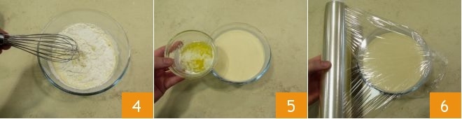 and gradually mix gently with a whisk 4 to avoid forming lumps. Also add the melted butter that has been left to cool slightly 5, mix this as well, then cover with plastic wrap and let the batter rest in the refrigerator for about half an hour 6.