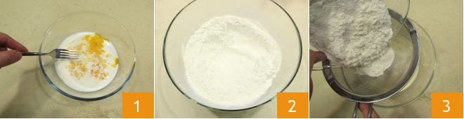 To prepare the ricotta and spinach crepes, begin by preparing the Sweet and savory crepes (Basic recipe). Melt the butter over very low heat in a saucepan and let it cool slightly; meanwhile, in a bowl, crack the eggs and mix them with the milk 1. Take the flour and pour the required amount into a bowl 2, then sift it directly into the bowl with eggs and milk using a sieve 3