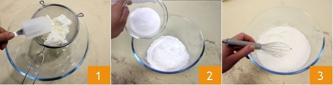 Before starting to prepare the ricotta shortcrust pastry, make sure to drain the whey from the ricotta by placing it in a fine mesh strainer and in the refrigerator, preferably overnight 1. Then sift the flour and pour it into a bowl, add the granulated sugar 2, a pinch of salt, and mix everything together 3.