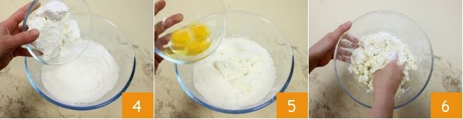 Take the drained ricotta, sift it well, and add it to the flour and sugar mixture 4. Add the yolk and whole egg 5, knead everything with your hands very quickly 6.