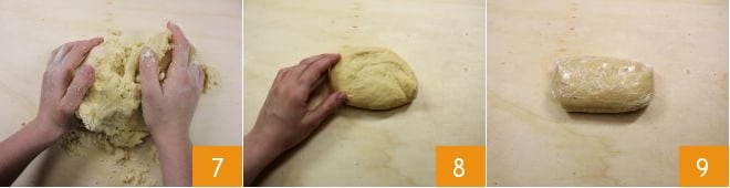 When the ingredients have combined, transfer the mixture to a work surface and handle for a very short time 7, just to even out and compact 8. Form a loaf and wrap it in plastic wrap 10, then place it in the refrigerator for at least half an hour before using it.