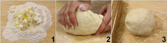 To prepare the ricotta triangles, start with the dough: place the flour, the butter (cold) cut into pieces, and the ricotta on a work surface 1 and knead the ingredients well to obtain a smooth and elastic dough 2. If during this process the mixture sticks to the work surface, sprinkle it several times with flour until the dough is elastic and dry. At this point, wrap the dough in plastic wrap 3 and place it in the refrigerator for at least half an hour.