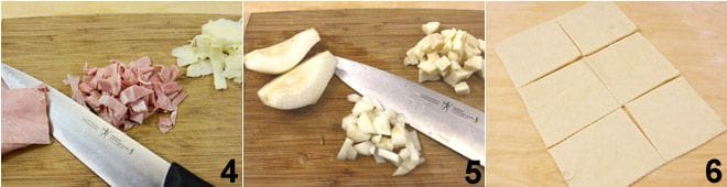 Meanwhile, prepare the fillings: cut the Gruyere into flakes and the Prague ham into strips 4; then peel the pears, remove the core, and cut them into small pieces 5, remove the crust from the taleggio and cut it into cubes. Take the dough out of the refrigerator and with the help of a rolling pin, roll out the dough into a rectangle shape with a thickness of about 1/16 inch. Using a fluted pastry cutter, cut the dough into squares with sides of about 4 inches 6.