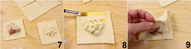 and place the previously prepared fillings in the center of them as follows: on one square of dough, place pieces of taleggio and a teaspoon of chopped pear; on another square of dough place the Prague ham strips and the Gruyere flakes 7. Beat an egg in a small bowl and with a brush, brush the edges of the dough squares 8, before folding them diagonally to form triangles 9. Once closed, place the triangles on baking sheets lined with parchment paper and brush their surface with the beaten egg, then bake them for 20-25 minutes at 355°F. Once cooked, place the triangles on a serving plate and serve immediately!