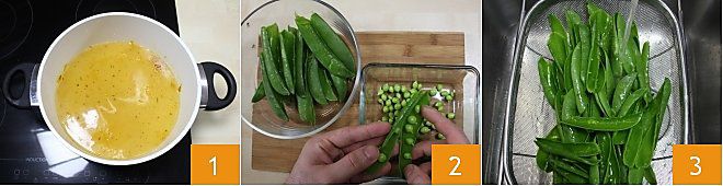 To prepare risi e bisi, first prepare a light vegetable broth and let it cool down 1. For details on preparation, see the Vegetable broth card. Meanwhile, shell the peas, keeping the pods aside 2. Once all the pods are shelled, rinse them well under running water 3 and drain them thoroughly