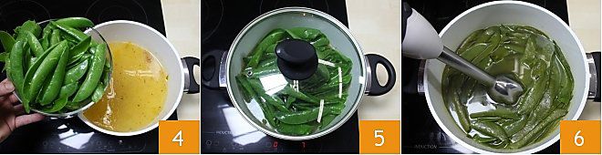 and immerse them in the saucepan with the broth 4, cover with a lid, and let them cook for 60 minutes over moderate heat from the resumption of boiling 5. After cooking, blend the pods with an immersion blender without removing them from the broth 6