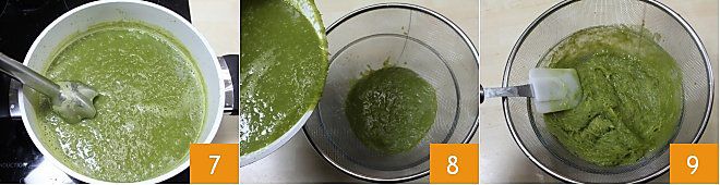 until you obtain a puree 7, pour it into a fine-mesh sieve placed over a bowl 8, and press the puree well with a spatula to eliminate the too fibrous part of the pods 9