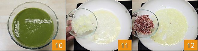 collecting all the juices that will come out 10 and keep them warm. At this point, proceed to cook the rice: melt half of the butter in a large pot and sauté the finely chopped onion 11. Once the onion has become golden, it will take about 10-15 minutes of cooking over low heat, add the chopped bacon 12