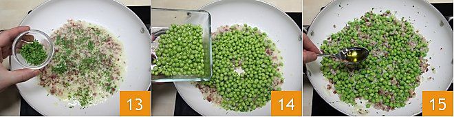 and the chopped parsley 13. Let it flavor for a couple of minutes and then add the peas 14, and a tablespoon of oil to flavor everything 15
