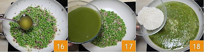 pour two ladles of broth or hot water and mix, cooking for 5 minutes 16. Then add the broth obtained with the pods along with the peas 17, adjust the salt and pepper, and bring to a boil. Then add the rice 18 and adjust the salt if necessary