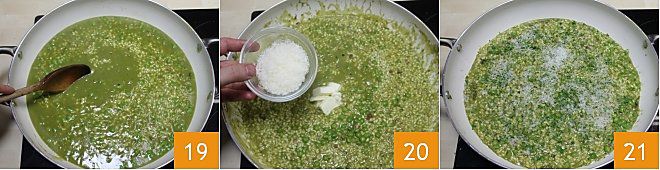 and cook it al dente, stirring often with a wooden spoon 20; at the end of cooking, the consistency of risi e bisi should be that of a soup, but not overly brothy. Turn off the heat and blend the rice with the other half of the butter and the grated cheese 20. If you like, you can add more chopped parsley 21 and serve the risi e bisi piping hot!