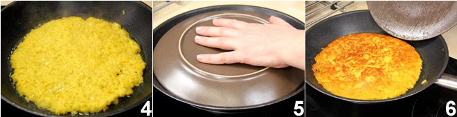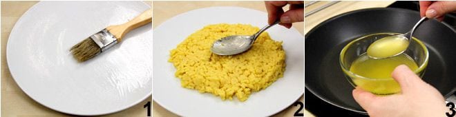 To prepare the fried rice, first grease a plate 1 and divide the rice into 4 equal parts (if you don't know how to prepare yellow rice, see how to do it Saffron risotto), then take one portion and flatten it with the back of a spoon 2 to form a thin disk. Heat a pan with a diameter of 9.5 inches and place a tablespoon of clarified butter in the center of it 3 (if you don't know how to make it, see how to obtain it by clicking here); transfer the rice disk to the pan using a thin, long spatula which you will slide under the rice to detach it from the plate. If the disk breaks during this operation, don't worry: reassemble it in the pan with the back of the spoon.