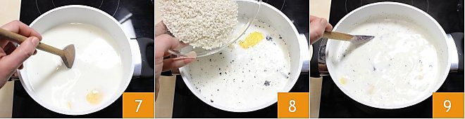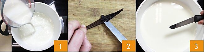 To prepare the rice pudding, heat the milk in a high-sided saucepan over medium heat 1, use a small knife to cut a vanilla bean and scrape out the seeds by running the blade along the inside of the pod 2. Add half of the pod and the seeds into the milk 3.