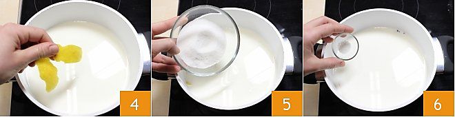 Wash a lemon and peel the zest, then add it to the milk 4. Next, pour in the granulated sugar 5 and the salt 6.