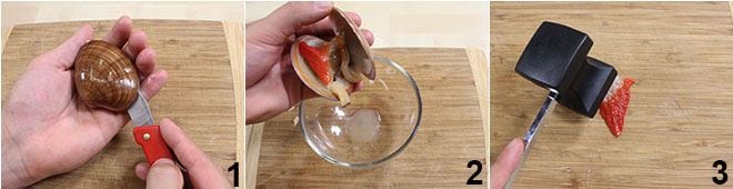 To prepare risotto with clams, start by cleaning the mollusks (following the instructions you can find clicking here for more details): open the raw mollusks by holding them by the shorter side of the shell, then cut the two internal side muscles 1. Collect their water during the opening 2 and detach the clams from the shells. Pound each mollusk with a meat tenderizer 3,