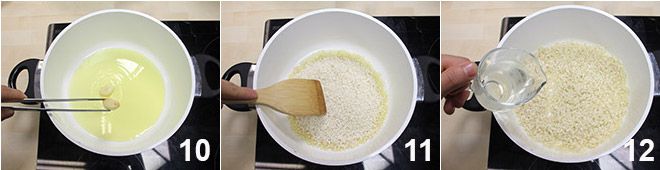 In a pan, sauté the two garlic cloves with extra virgin olive oil. Once they are golden, remove them 10 and add the rice; toast it for a few minutes over low heat, stirring it often 11 to prevent it from sticking to the bottom of the pot, then deglaze with white wine 12.