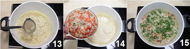 Continue cooking, always over low heat, for about 20 minutes, gradually adding the clam liquid 13 (remember to wet the rice only when it has absorbed all the previously poured liquid). Since the clam water is very salty, we suggest tasting the rice: if it turns out to be too salty, you can alternate the clam liquid with fish broth or water. When the rice is almost done cooking, add the clams 14, plenty of chopped parsley 15 and mix everything well with the help of a wooden spoon.